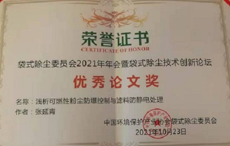 同時(shí),論文“淺析可燃性粉塵防爆控制與濾料防靜電處理”喜獲優(yōu)秀論文獎(jiǎng)。