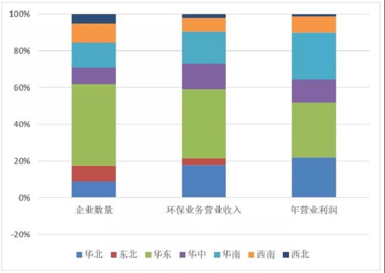 統(tǒng)計(jì)范圍內(nèi)有約45%的企業(yè)集聚于華東地區(qū),該地區(qū)貢獻(xiàn)了全國38%的環(huán)保營收,吸納了37%的從業(yè)人員。其次為華南地區(qū),以14%的企業(yè)數(shù)量占比貢獻(xiàn)了18%的環(huán)保營收,吸納了19%的從業(yè)人員。華北、華中、華南地區(qū)人均營業(yè)收入均高于全國平均值(105.2萬元/人)。華東、西南、西北、東北地區(qū)則低于全國平均水平。2020年數(shù)據(jù)顯示,廣東、北京、湖北、浙江、江蘇、山東6 省(市)企業(yè)營收總額均超過 1000 億元,6 ?。ㄊ校┉h(huán)保企業(yè)營收總額,占全國的占比超過了 2/3。長江經(jīng)濟(jì)帶 11 省(市)以 36.7%的企業(yè)數(shù)量占比貢獻(xiàn)了近一半的產(chǎn)業(yè)營收。
