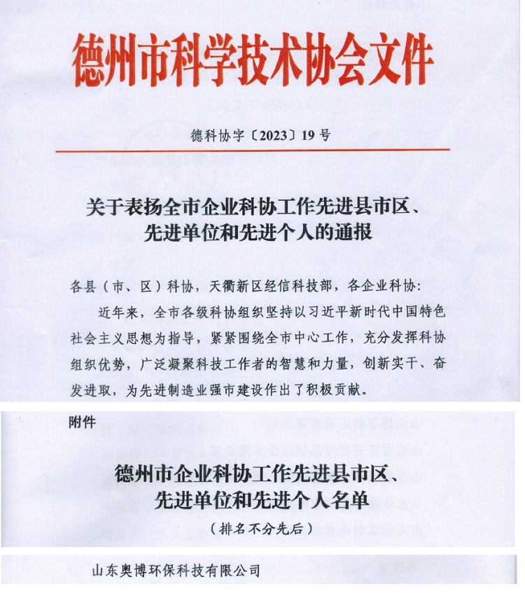 山東奧博環(huán)??萍加邢薰鞠搏@得企業(yè)科協(xié)工作“先進(jìn)單位”榮譽(yù)稱號(hào)。
