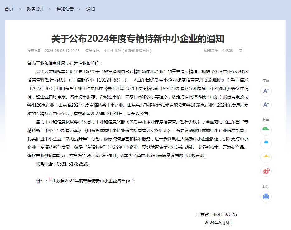 山東省工業(yè)和信息化廳近期公布2024年度山東省專精特新中小企業(yè)名單,我司順利通過本次復審工作,再次獲得專精特新中小企業(yè)的殊榮。